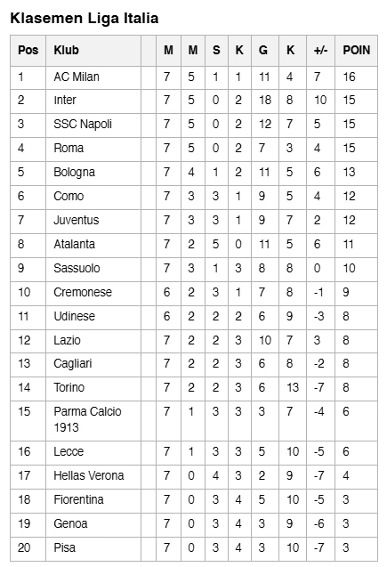 AC Milan sukses mengakhiri giornata ketujuh Serie A 2025/2026 sebagai pemuncak klasemen sementara Liga Italia. Sementara itu, Juventus harus menelan kekalahan pertamanya musim ini.